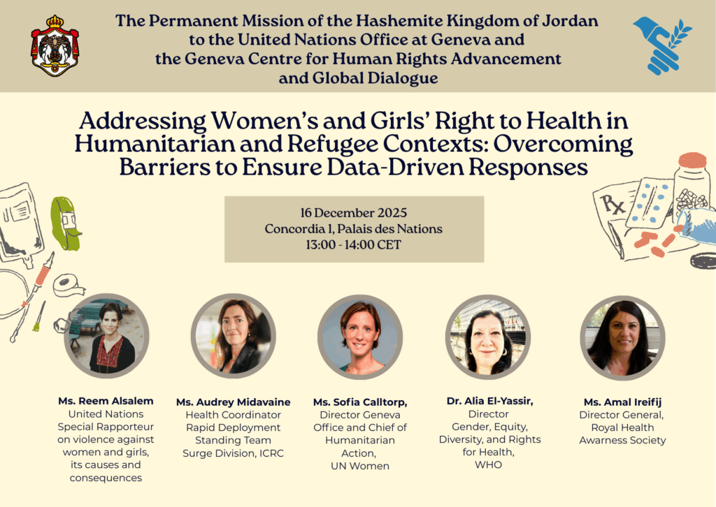 Geneva, 17 December — On 16 December 2025, the Geneva Centre for Human Rights Advancement and Global Dialogue, in partnership with the Permanent Mission of the Hashemite Kingdom of Jordan to the UN in Geneva, convened a panel event entitled “Addressing Women’s and Girls’ Right to Health in Humanitarian and Refugee Contexts: Overcoming Barriers to Ensure Data-Driven Responses” at the Palais des Nations. The event was held in the framework of the Global Refugee Forum Progress Review 2025.