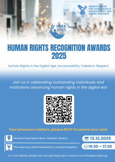 The Geneva Centre for Human Rights Advancement and Global Dialogue is pleased to announce the recipients of the Human Rights Recognition Awards 2025.