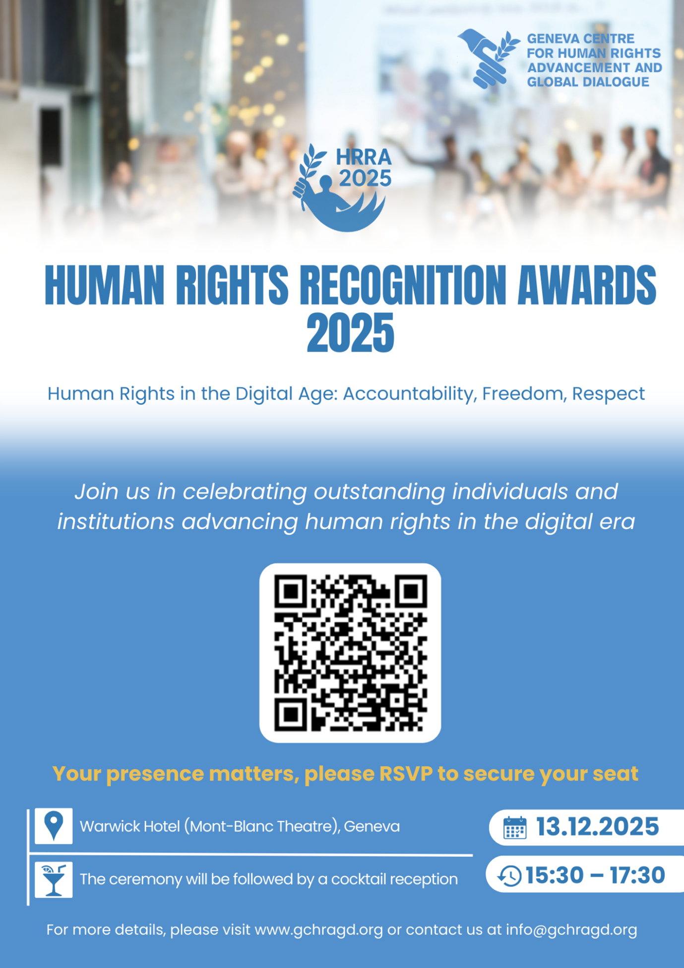 The HRRA 2025 Ceremony will take place on Saturday, 13 December 2025, at the Warwick Hotel in Geneva. The event will bring together partners, experts, and awardees dedicated to advancing human rights in the digital age.